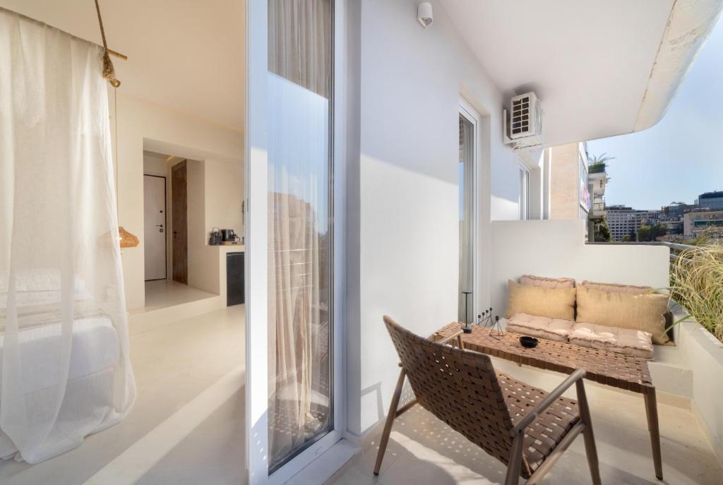 Gèa Athenian Suites are thoughtfully laid out to maximize both comfort and functionality. Each apartment boasts a spacious bedroom adorned with a contemporary flat-screen TV equipped with streaming services, ensuring guests can relax in style. The equipped kitchen, complete with essentials like a toaster, fridge, and coffee machine, is a haven for those who wish to dabble in culinary delights or simply enjoy a morning brew. The living area, with its plush sofa and dedicated dining space, invites guests to unwind after a day of exploration. The pièce de résistance is undoubtedly the bathroom, featuring a luxurious walk-in shower and complemented by a range of premium toiletries. Every suite is accentuated by a charming balcony, a perfect spot to soak in the ambiance of Athens. Combining modern amenities with a layout that speaks of island simplicity, Gèa Athenian Suites are truly where elegance meets ease.